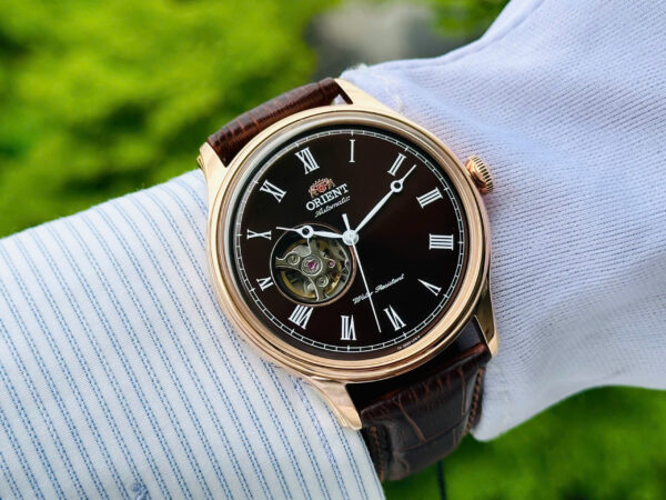 Đồng Hồ Nam Chính Hãng Orient Caballero FAG00001T0 Vỏ Mạ Vàng Hồng Mặt Số Màu Đen Cọc Số La Mã Thiết Kế Open Heart 43mm