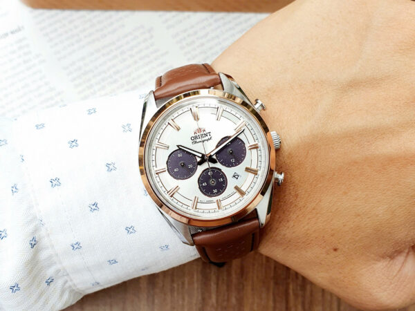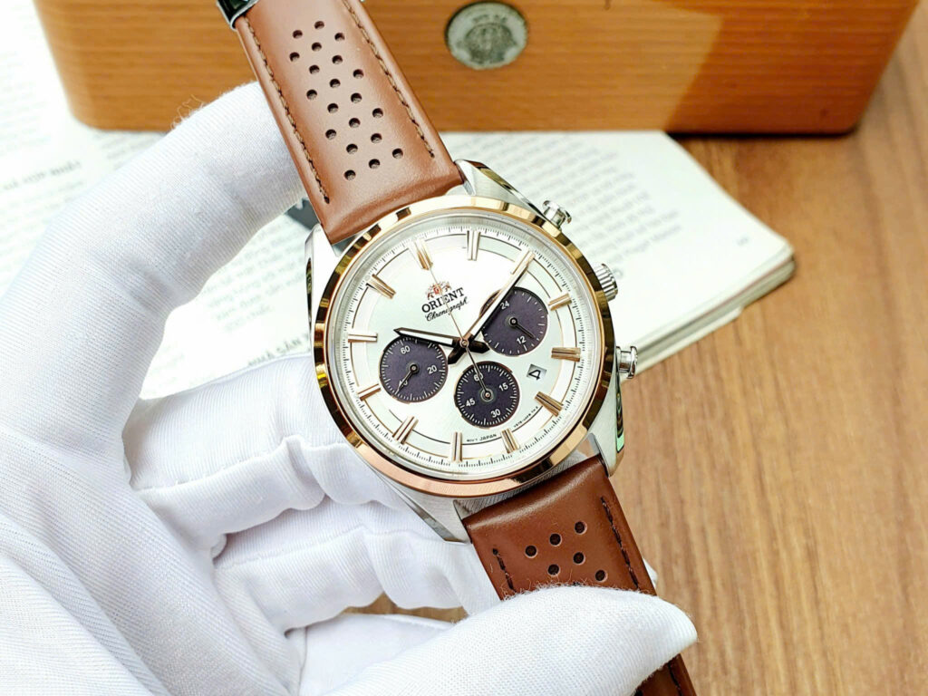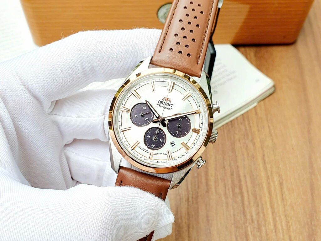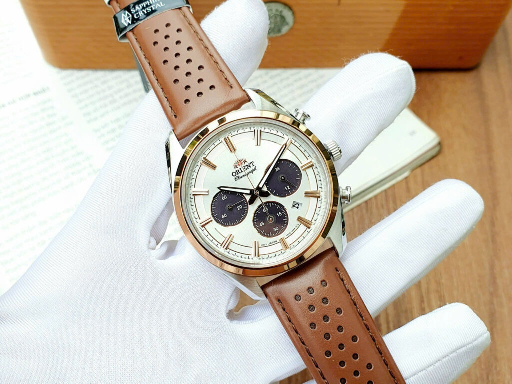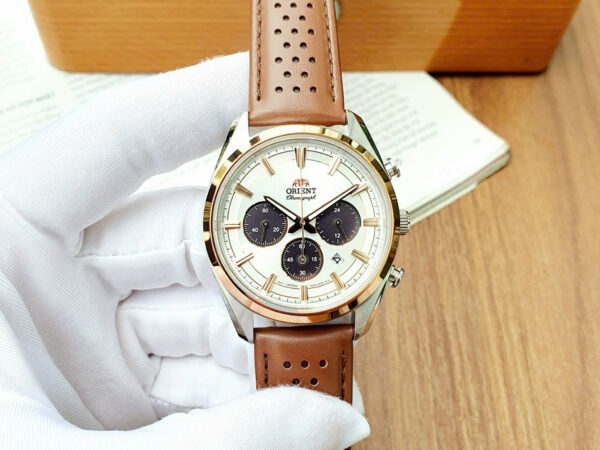 Đồng Hồ Nam Chính Hãng Orient Quartz Solar Contemporary Chronograph RA-TX0306S10B Mặt Số Màu Trắng Cọc Số Rose Gold Dây Da 41mm