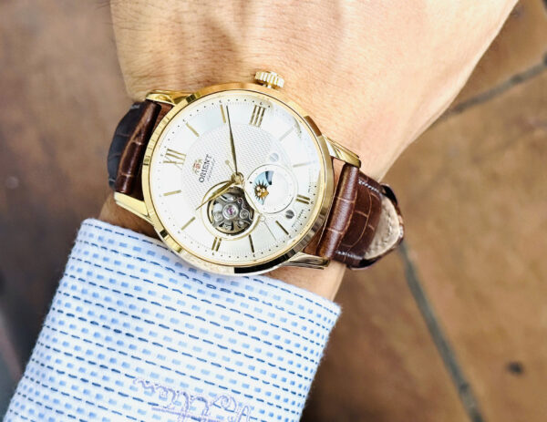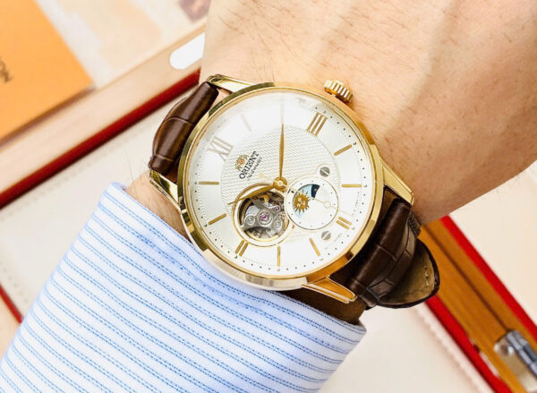Đặt mua Đồng Hồ Nam Chính Hãng Orient Sun Moon Gen 4 Open Heart RA-AS0010S10B Mạ Vàng Mặt Số Màu Trắng New Version 42mm