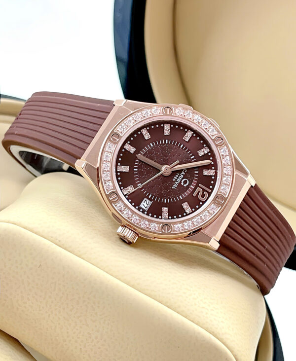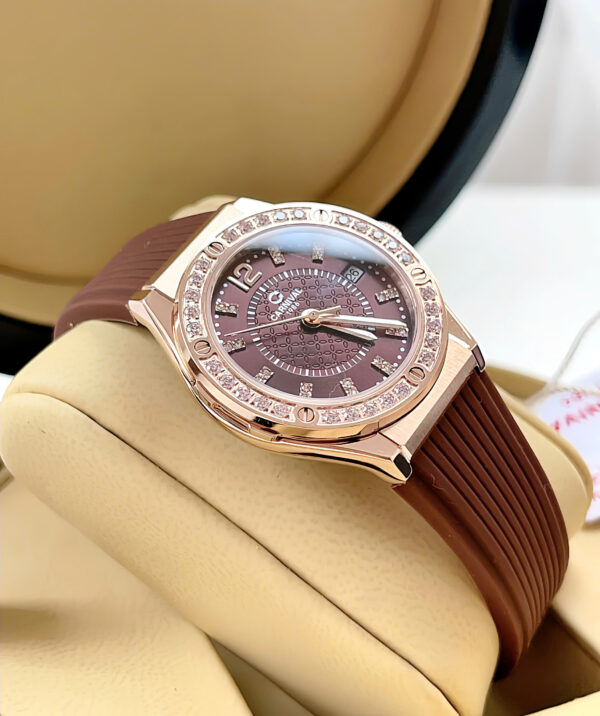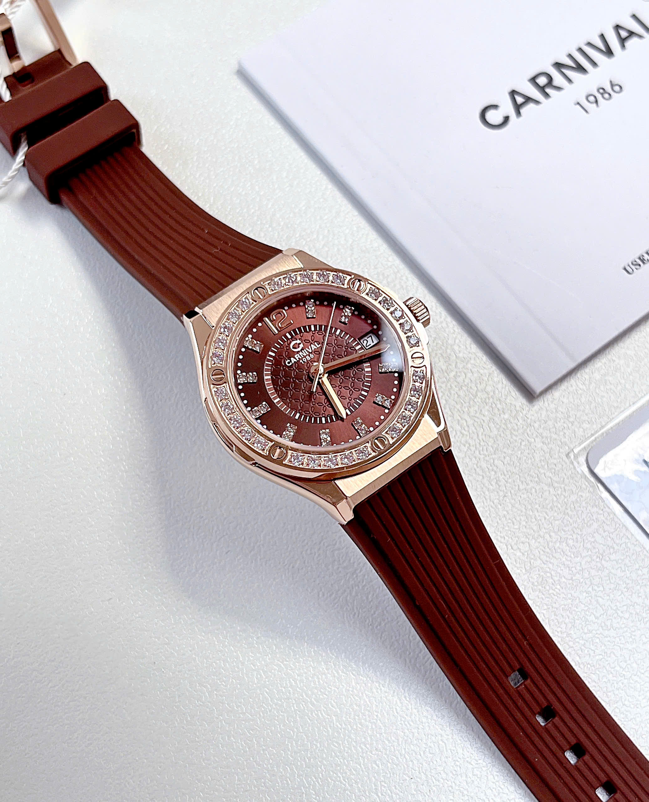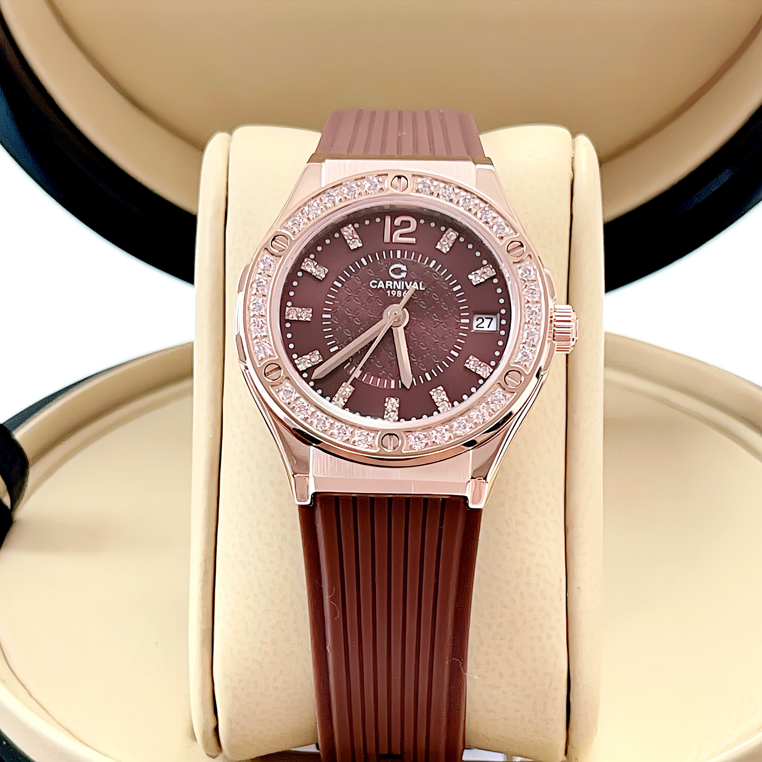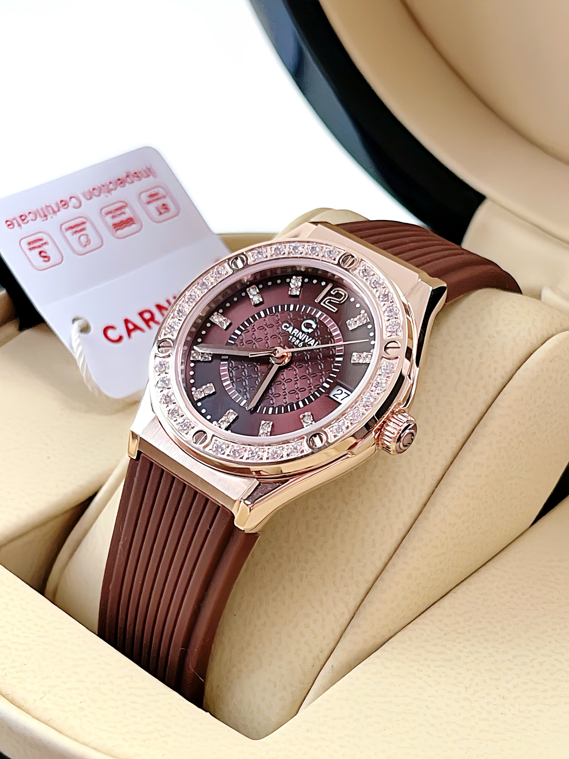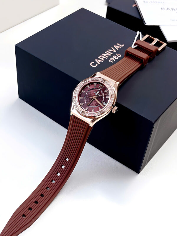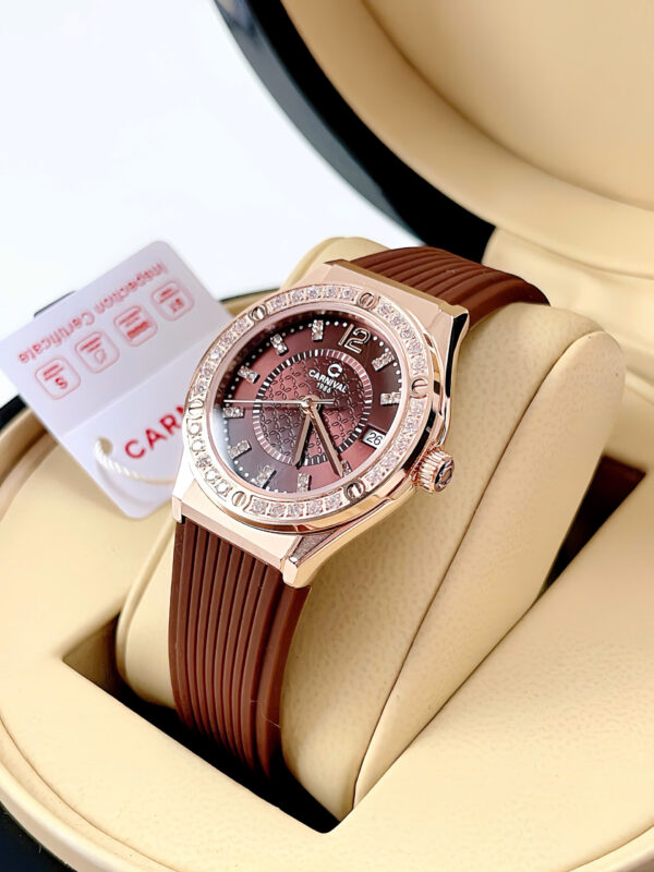 Đồng Hồ Nữ Chính Hãng Carnival 8173L2 Vỏ Mạ Vàng Hồng Mặt Số Màu Nâu Cà Phê Dây Viền Đính Đá 32mm